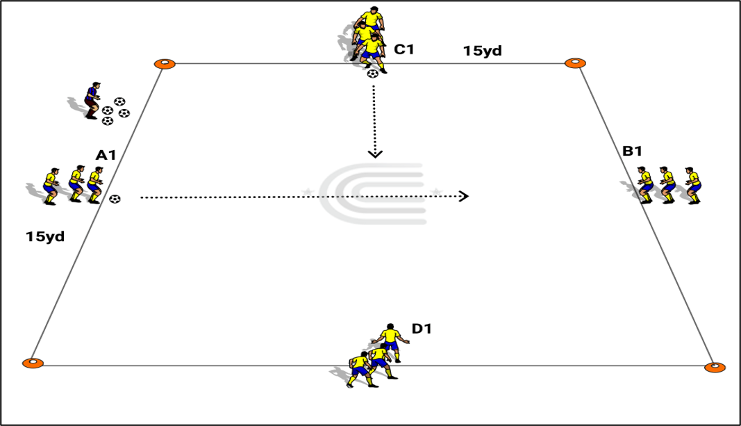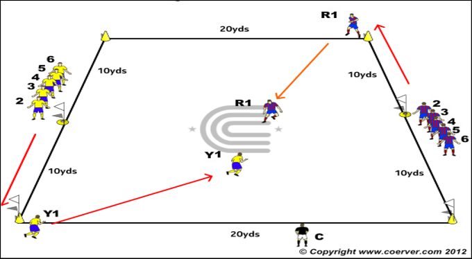 A 20x20yd grid marked with corner cones and two teams lined up at opposite mid points facing opposite directions.