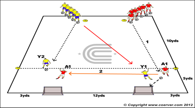 V1: Red A1 attacks the goal nearest his team as Yellow Y1 presses him. As soon as A1 shoots Yellow Y 2 attacks either of the two goals and A1 immediately must defend against Y2.