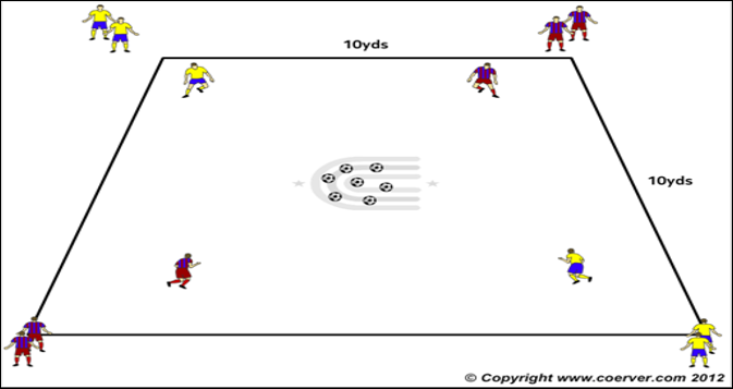 A 10x10yd square with up to 5 players at each corner. 7 Balls are placed in the middle.