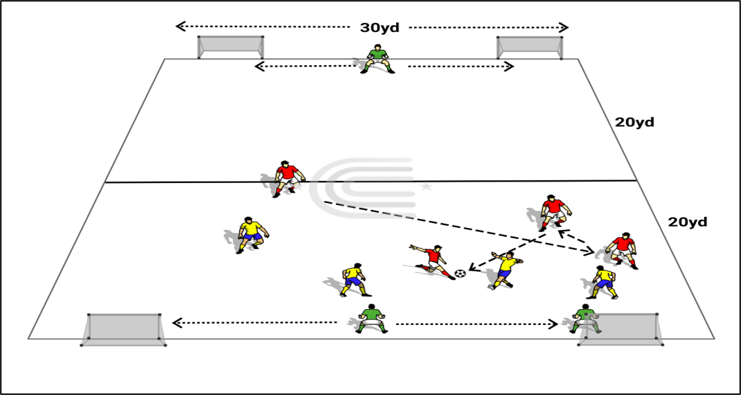 Players must get inside the 5yd shooting line to score. Make teams change sides so that players get used to challenges from either side.